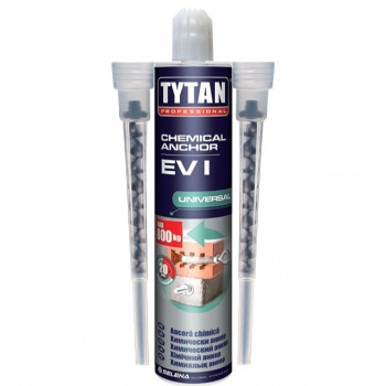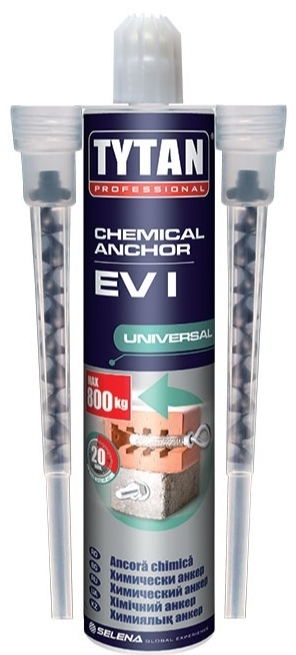 Химический анкер универсальный EV-I торговой марки TYTAN PROFESSIONAL служит для фиксации крепежа в твердые основания: бетон, натуральный и искусственный камень, пустотелый кирпич, газобетон. Средство быстро схватывается и обладает хорошей адгезией, армирует основание, заполняет и склеивает трещины. Готов к применению, не нужно срезать крышку. Прилагается 2 сменных миксера.