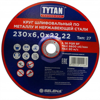 Круг шлифовальный по металлу и нержавеющей стали 230 x 6 x 22.2 мм TYTAN