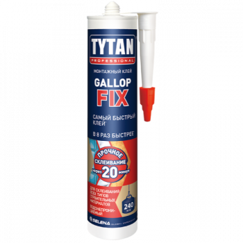 Клей GALLOP FIX торговой марки Tytan Professional - гибридный монтажный клей быстрого схватывания для склеивания широкого спектра отделочных материалов к типичным поверхностям, таким как бетон, штукатурка, древесно-стружечная плита, дерево, кирпич, стекло. Склеивает зеркала, материалы из пластика (кроме полиэтилена, полипропилена и тефлона).